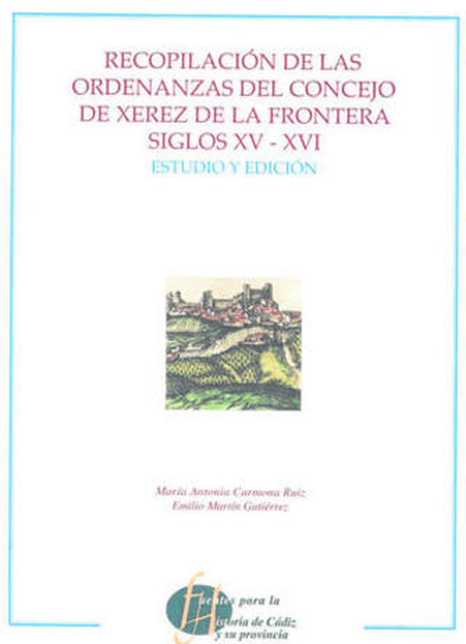 ACABA de publicarse por la Universidad de Cádiz y prologado por el catedrático de Historia Medieval y especialista en ordenanzas medievales de la Corona de Castilla, Alfonso Franco Silva, la Recopilación de las ordenanzas del concejo de Xerez de la Frontera, siglos XV-XVI, Estudio y edición. Los autores son los profesores Mª Antonia Ruiz Carmona y Emilio Martín Gutiérrez y la publicación ha salido a la luz con el nº 8 de la colección 'Fuentes para la historia de Cádiz y su provincia'. El importante volumen, de 582 páginas, cuenta con un estudio introductorio de la cuestión, la transcripción de las ordenanzas divididas en cuatro grupos temáticos, siete apéndices, cuatro índices y una sección dedicada a bibliografía.