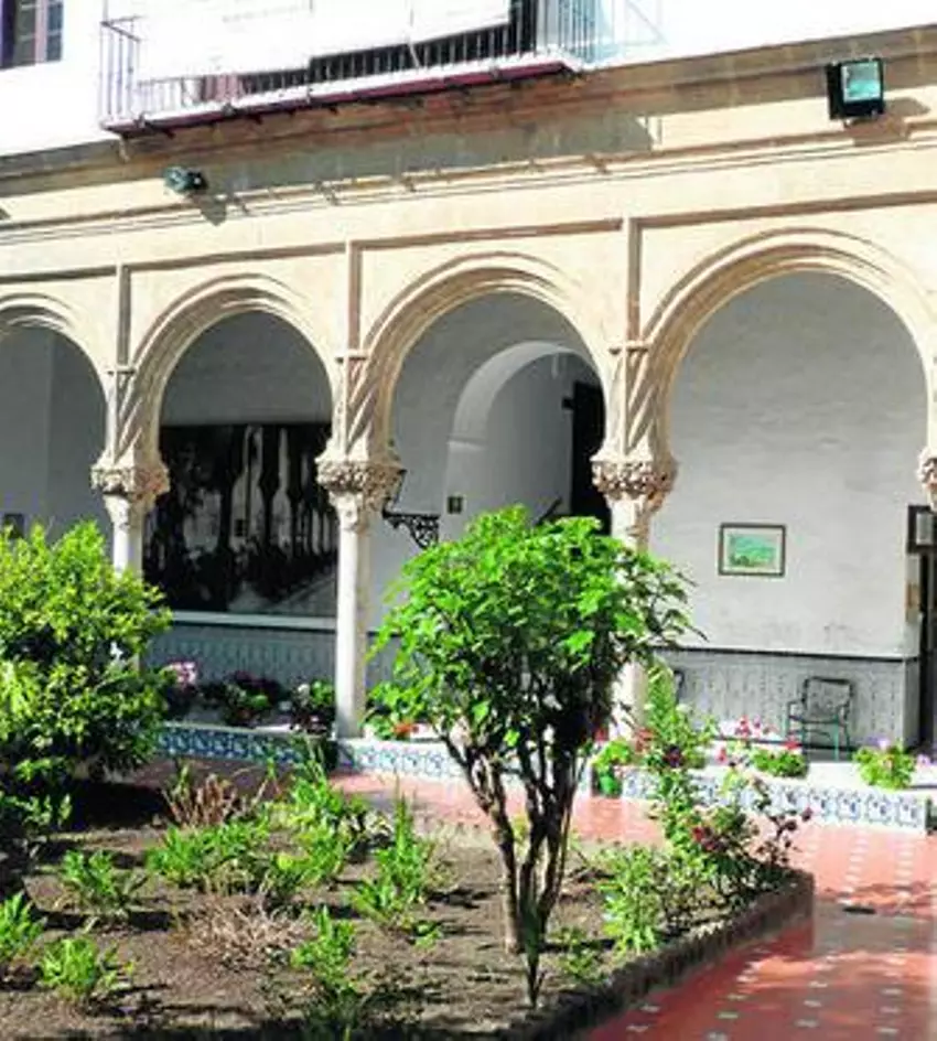 El patio presenta dos galerías, aunque en los extremos de ambas aún se aprecian los arranques de las otras dos pandas que hubiesen acabado por cerrarlo por completo. Cada galería tiene dos pisos, aunque el superior, sin ningún tipo de concesión a la ornamentación, parece un añadido posterior. La planta baja se resuelve mediante arcos de medio punto peraltados, seis en cada panda, enmarcados por un alfiz. Estos arcos apean en columnas, fabricadas con piedra de Martelilla, de orden compuesto. En el frente de cada capitel encontramos un blasón. Hay que señalar que los arcos no descansan directamente sobre las columnas, sino sobre un cimacio. Estos cimacios se hallan decorados con motivos vegetales y otros derivados de los bestiarios de tradición medieval, tales como máscaras, figuras grotescas, sirenas, querubines, peces y lobos. En el muro interior del patio hay una ménsula formada por un capitel idéntico a los de las columnas del patio, con su cimacio en la parte superior, en el que se representa en el centro a un grifo y a un león enfrentados y en los extremos dos cabezas, una con una corona y la otra, de rasgos negroides, con algo similar a un tocado de plumas. Esta ménsula se remata en su parte inferior por una estructura semiesférica con tracería ojival calada muy parecida a la que encontramos en Jerez el dormitorio bajo del convento de Santo Domingo o las bóvedas de parroquias de San Marcos y San Miguel. La única diferencia entre las dos galerías del patio es que en una de ellas, sobre el cimacio y formando el arranque de los arcos, encontramos una estructura cilíndrica similar a un pilar con estrías helicoidales que acaban por morir en las molduras de los arcos.