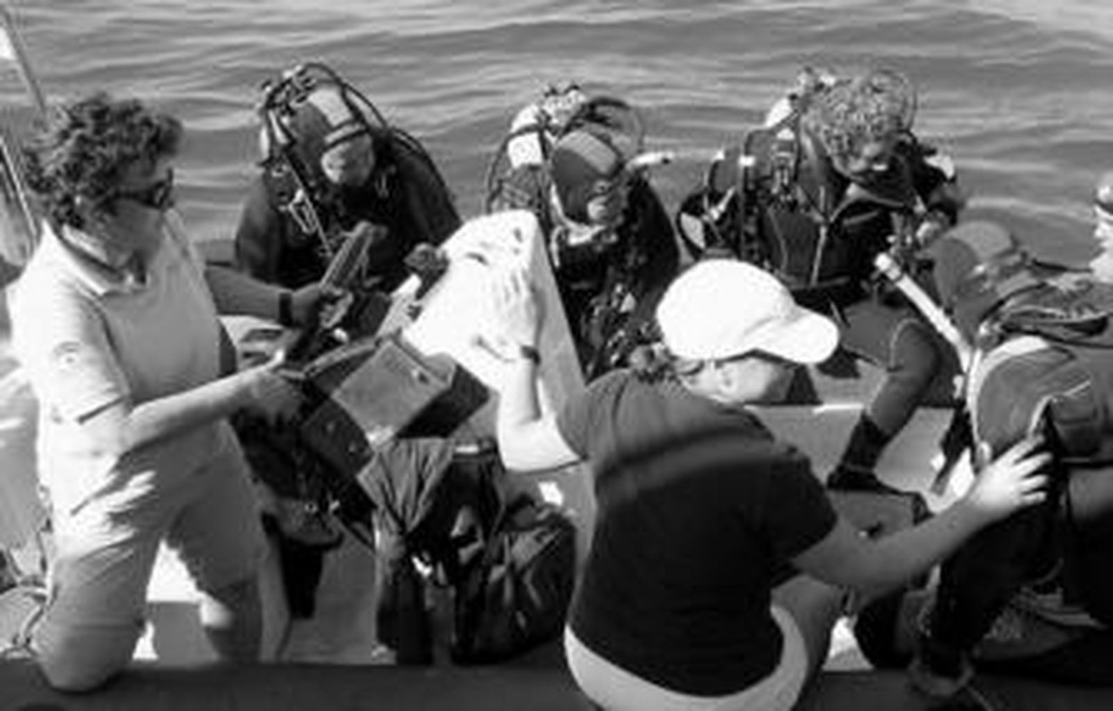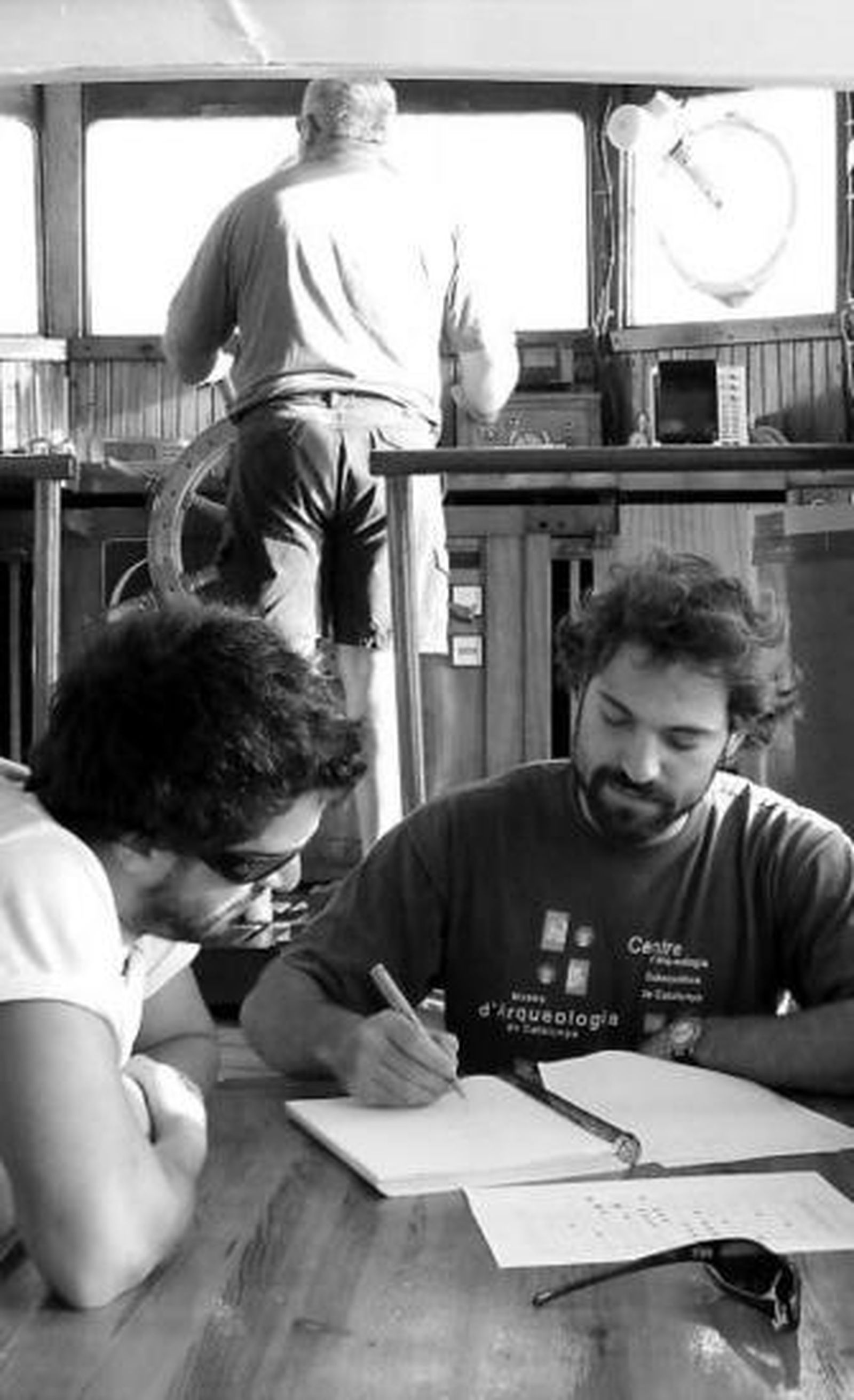 Menos sorprendidos andaban los técnicos del CAS Quique, Aurora, Pepi, Mercedes y Mila, que en campañas anteriores han estudiado el pecio. Aunque siempre puede aparecer algún dato de interés, afirma Gustau Vivar, "por lo que cada cierto tiempo se retoman las técnicas de prospección circular o lineal que hoy estamos llevando a cabo", dice. La primera de las prácticas inspecciona el yacimiento en 18 metros de radio y a 11 metros de profundidad, mientras la segunda rastrea el terreno a lo largo del pecio. "Todo se va anotando en las tablillas bajo el agua, se pasa a posteriori a una ficha y el documentalista controla el material anotado por el arqueólogo, por si hay novedades", añade Vivar.