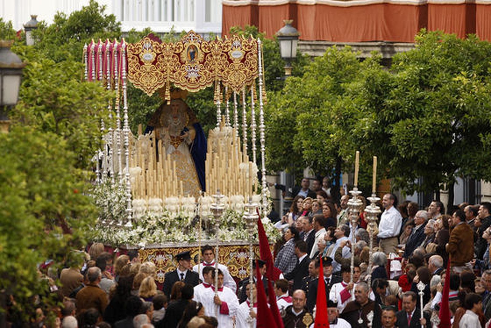 Ya en Cristina, los palcos recibían con aplausos a los dos pasos. El del misterio entraba a los sones de la Marcha Real, justo cuando se soltaban varias palomas. El de la Virgen del Refugio lo hacía con Estrella Sublime.