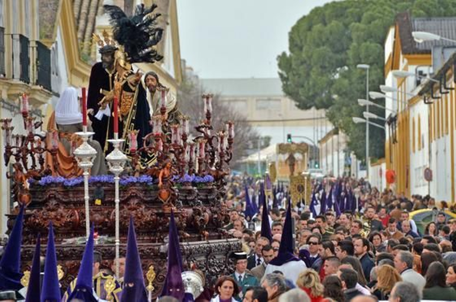 A forma de capataz y guía, el imponente romano de plumas negras parece señalar a Jesús a donde tiene que dirigir la mirada y camino, justo al pueblo, justo a aquellos que son testigos de las maniobras de los hombres que mecen al Rey de Santa Ana, mientras éste se ve a sí mismo reflejado en el paño de la Mujer Verónica. Tras la salida del romano, los sones de La Sentencia anuncian, aunque no hace falta porque los aplausos se adelantan a la corneta, que Jesús de las Misericordias ya está en la calle. La situación del cielo oscurece aún más la perfecta canastilla caoba obra de Manuel Guzmán Bejarano, que porta las seis imágenes que componen el conjunto escultórico de la hermandad.