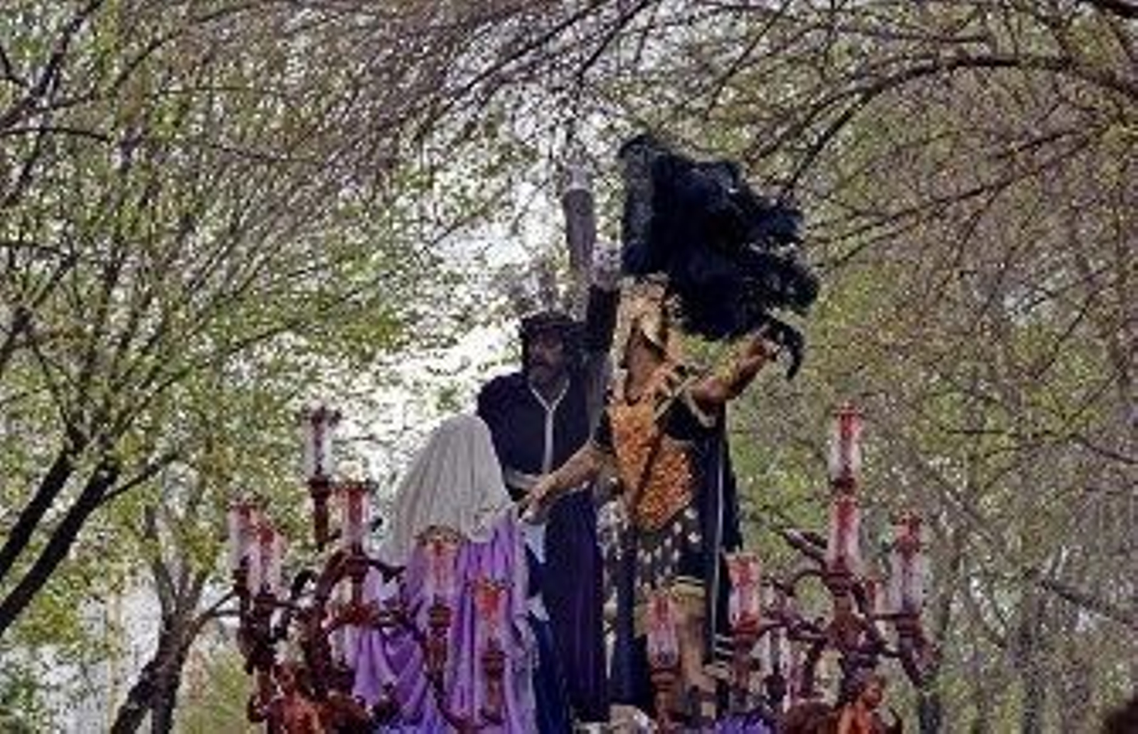 Algunas cabezas de los costaleros del palio asoman ya tímidamente desde el balcón cuando las inmensas puertas se abren y la cruz de guía se planta en la calle desafiando una tarde donde el sol este año no ha sido el protagonista de la jornada. Mientras una marea de nazarenos morados y blancos pone su camino hacia la calle Pizarro, los cuellos de los vecinos de La Plata ya buscan a su Señor y están deseando pedir misericordia y secarle las lágrimas a la Virgen niña.