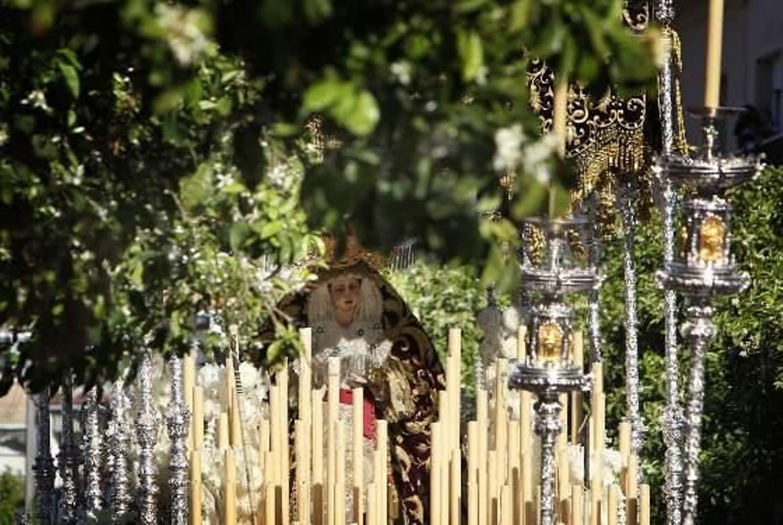 La tarde fue, como cada Domingo de Ramos, diferente alrededor de Los Desamparados. Tarde y noche grande en sabiduría cofrade y en la determinante influencia de La Coronación en la realidad de la actual Semana Santa. Es ineludible la impronta de esta hermandad, también acompasada por un entorno adecuado y perfectamente dibujado para recibir a los nazarenos blancos y negros. El barrio, la gente, el aroma del azahar de los naranjos de Arcos, son algunos de los elementos que forman parte de un escenario exclusivo que ayer formó parte de ese momento muy cofrade que es la salida de la hermandad. La Coronación puso su plateada cruz de guía puntual en la puerta. A quince minutos de las seis de la tarde los primeros nazarenos empezaron a conformar el cortejo en la calle y desde ese instante las elegantes túnicas tomaron por completo la calle Arcos buscando Gaspar Fernández y Bizcocheros. La voz de Manolo Campos empezó a dejarse oír desde dentro hacia fuera, señal inequívoca que media hora después de la Cruz de Guía, el misterio del Señor en su Coronación empezaba a abandonar Los Desamparados. Y lo hizo con el clásico andar de este misterio aderezado con la marcha Coronación de Espinas, una referencia de la música cofrade jerezana. La banda de la Caridad hizo ayer su primer ‘paseíllo’. El remate de la puesta en la calle fue con la salida de La Paz, Dolorosa que está de aniversario al cumplirse 60 años de su llegada a la hermandad, una efemérides que ahora se está celebrando y que tendrá en el otoño su momento culminante. Y mirando la trasera del palio, el manto de La Paz protagoniza otra fecha para el recuerdo, los 50 años de su creación por Elena Caro. Por encima de estas fechas, ayer fue la Paz de siempre con su nube de incienso por delante y a su alrededor perfumando su paso, con la música y compás costalero y buscando los vericuetos del alrededor de San Pedro donde se vivieron un año más esos momentos de enorme engrandecimiento cofrade que al mismo tiempo son ineludibles para conocer en toda su dimensión el Domingo de Ramos, según Jerez.