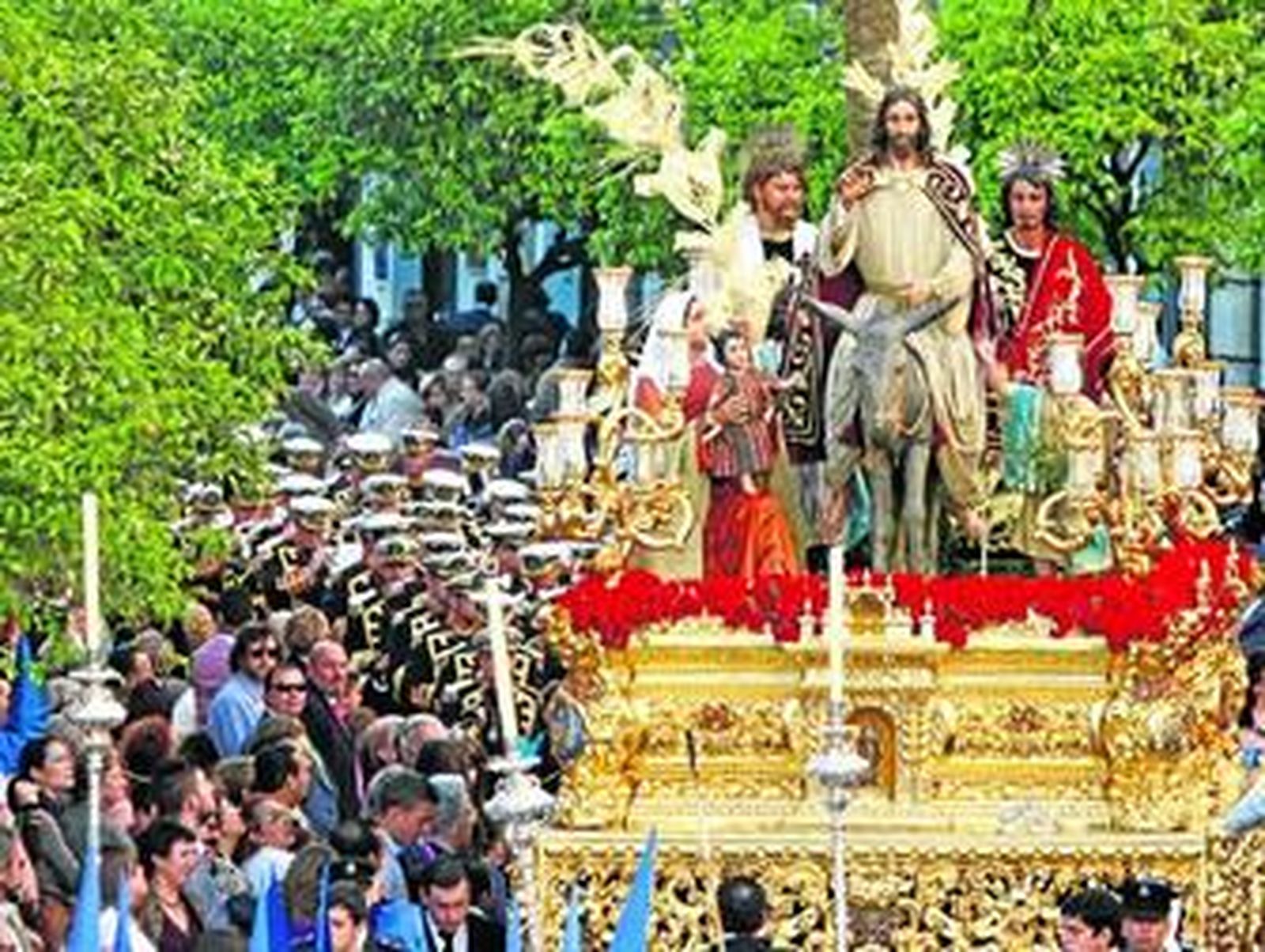 Entre los naranjos cuajados de azahar avanza con paso firme la inconfundible cruz de guía que tallaran en su día los hermanos Juan y Abelardo Buzón. Su paso es anunciado por el repique alborotado de las campanillas que portan los más pequeños de la hermandad. Tras ellos, un mar de amarillas palmas anuncian que dentro de poco el hijo de Dios volverá a entrar triunfal por las calles de Jerez.