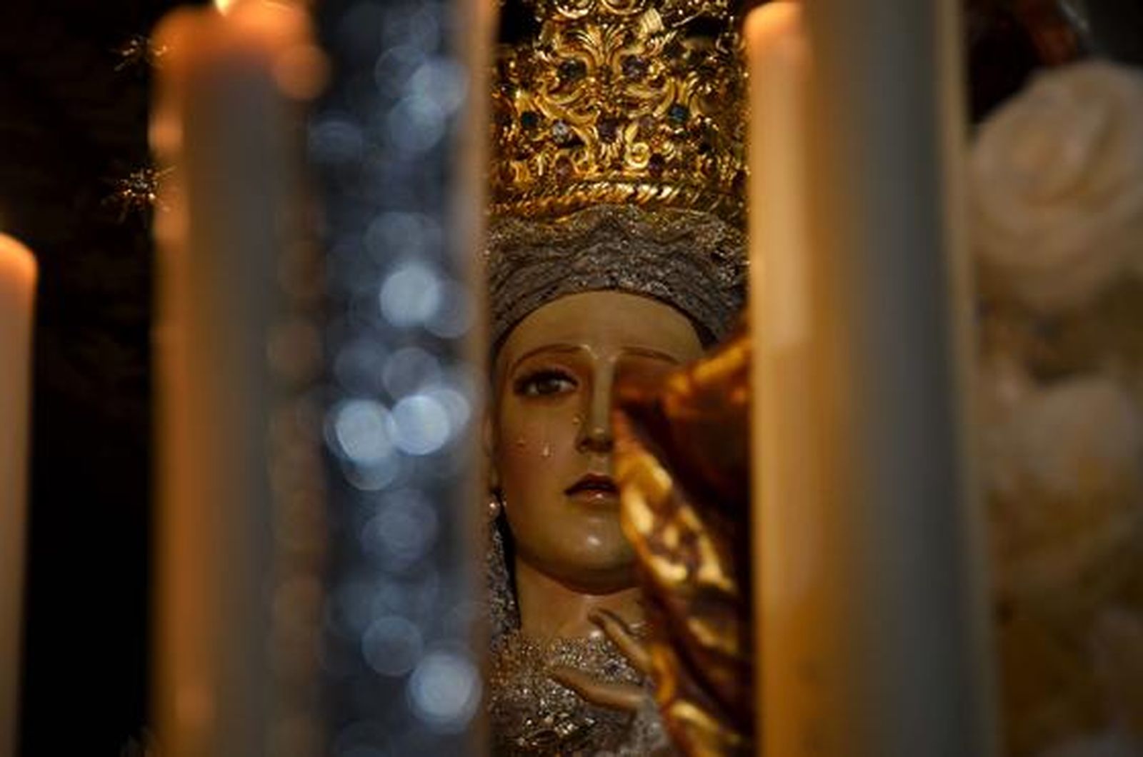 Por su parte, María Santísima de la Confortación, con treinta costaleros a la voz de José Luis Sánchez, se plantaba en la Alameda Cristina a los sones de la Banda Sinfónica Municipal de San Fernando, que ya en el interior del templo había interpretado 'Mater Mea' en recuerdo de los que ya no están entre nosotros. El palio lució exquisito con un exorno formado por alelíes y rosas blancas.