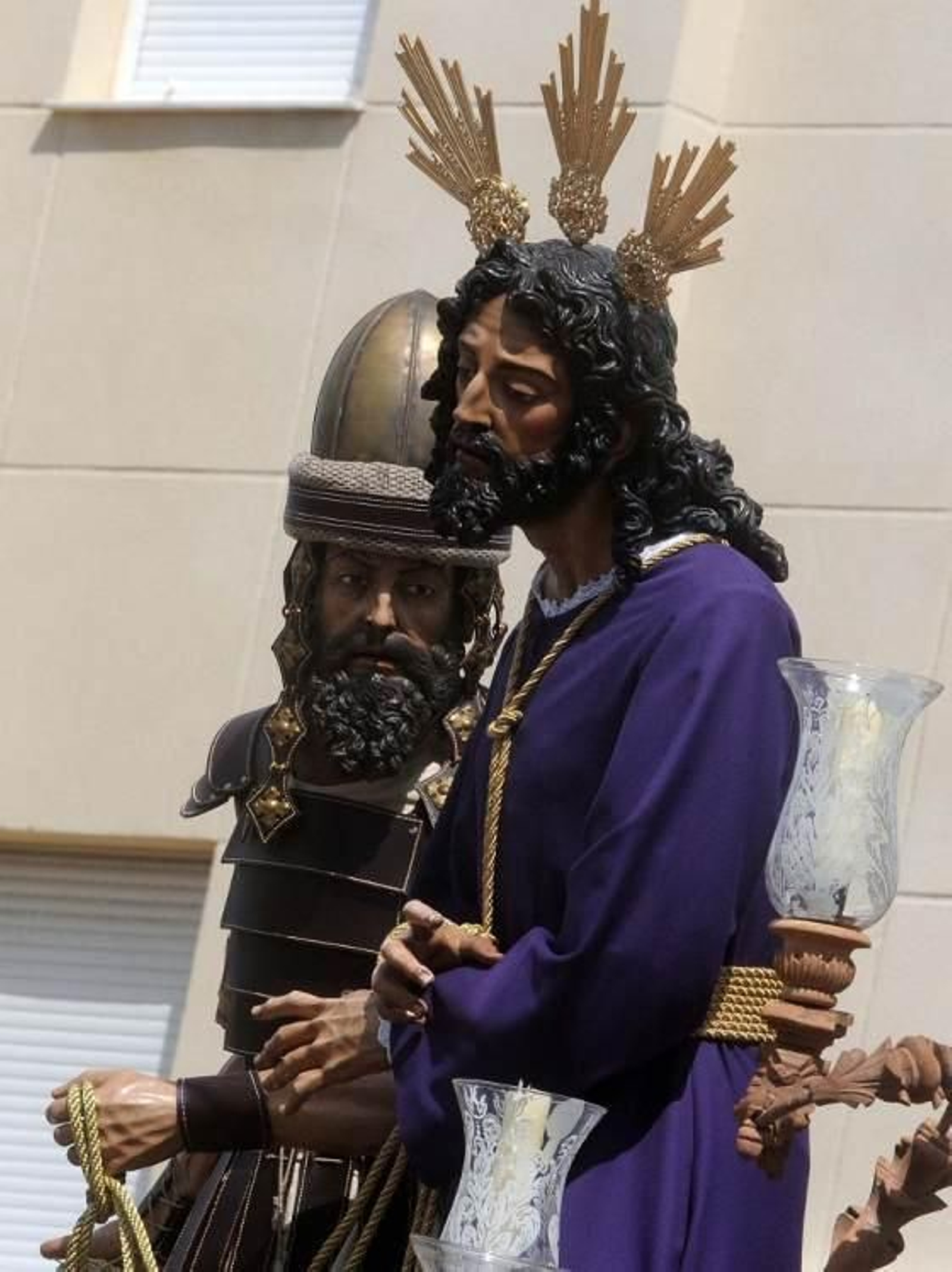 Y entonces, comenzó lo bueno. 'Sanctus', interpretada por la Agrupación de la Sentencia, comenzó a sonar en la plaza Ronda con el misterio encarando la puerta del templo. Sones fuertes de la Plazuela para La Granja. Con el Señor ya en la calle, que volvió a lucir túnica morada, y tras el himno, se pudo escuchar 'Prendio en Santiago' y 'Jesús Cautivo', dos marchas que terminaron de poner boca abajo el barrio.