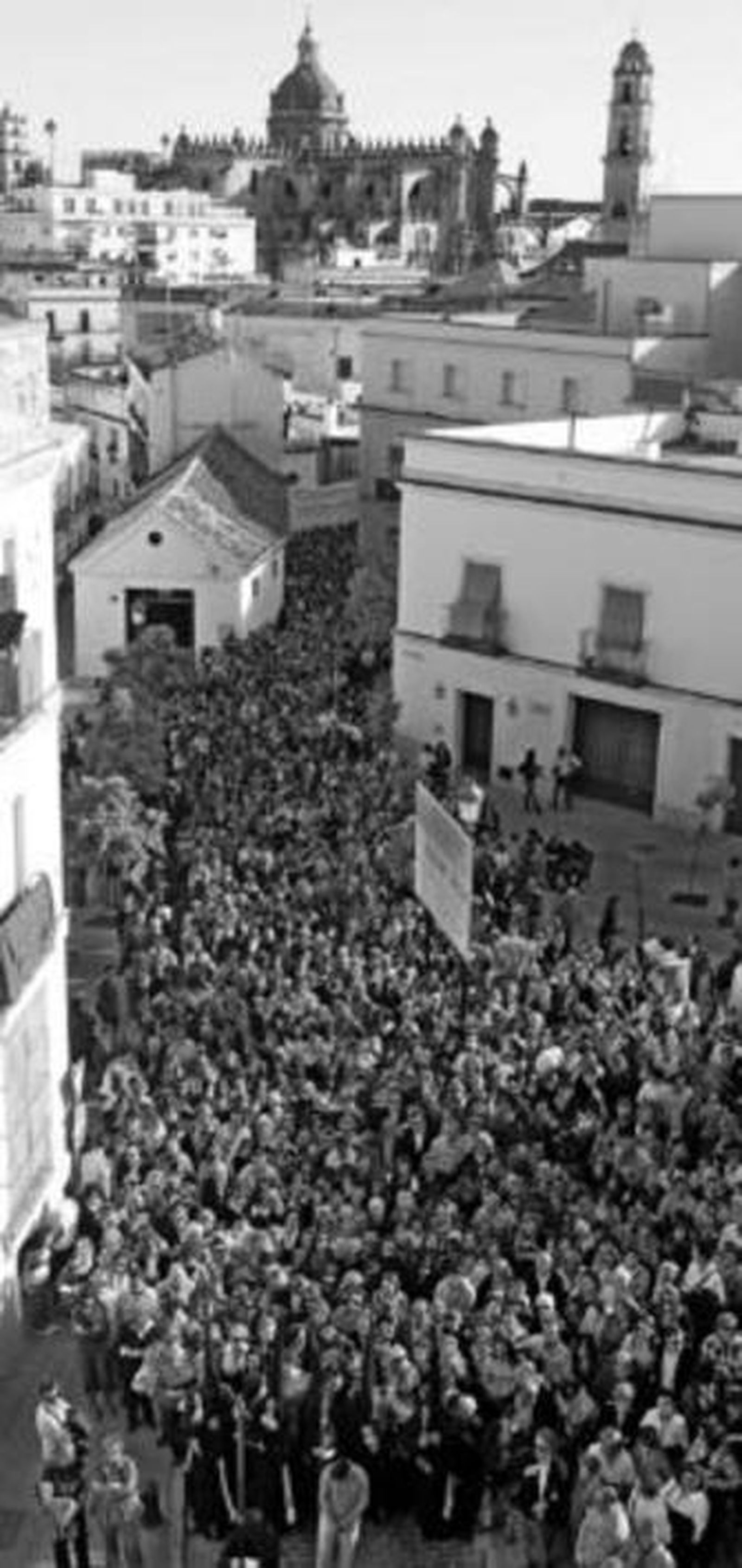 Poco a poco se forma el cortejo de rigurosa penitencia, ya se escuchan las voces limpias e infantiles de la Escolonía y la multitud, devota y recogida, se agolpa tras el paso para realizar junto a la hermandad de San Lucas su estación penitencial. Es un fenómeno social que, año tras año, se ha convertido en el gran patrimonio espiritual de la Semana Santa jerezana, uno de sus momentos inolvidables cargado de sentimientos.