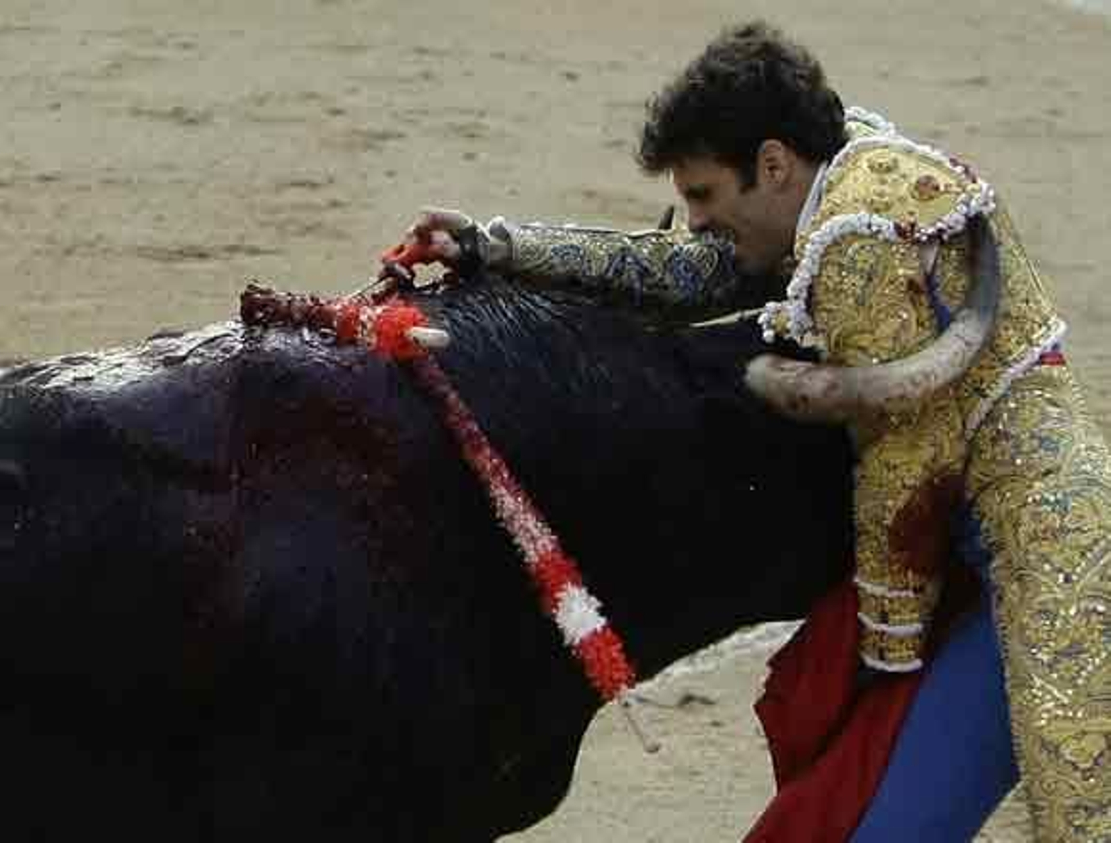 Con la muleta empezó a calentar en su primera faena después de dos series de tanteo. El toro la tomaba, sin llegar hasta el final. Faltando ese tramo de embestida el torero se obligaba a aguantar y tirar con increíble quietud. Valor en estado muy puro, más aún sacando la muleta por debajo de la pala del pitón. Así ligó los pases a derechas en número de cuatro y hasta de cinco con el oportuno remate, repitiendo en tres series. Al natural parecía en principio que no iba, pero también le obligó. Fue todavía más lento, más profundo. Y los remates, por abajo, únicos. Mató más con el corazón que con la cabeza, quedándose en la cara. Pero mató. Y las dos primeras orejas.