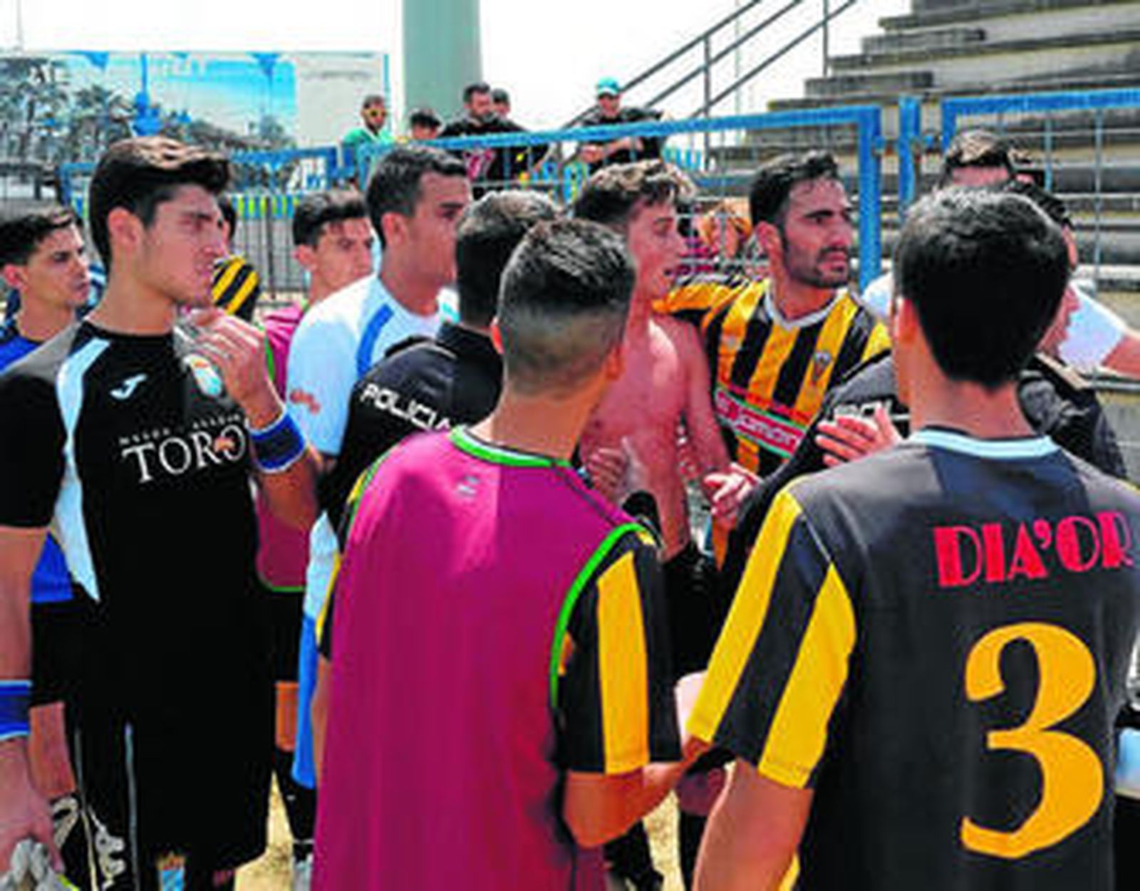 En la esquina se mezclaron futbolistas de uno y otro equipo intentando unos proteger y otros agredir al causante de los incidentes, mientras que la policía también intentaba poner orden. Después de más de diez minutos de trifulca, los ánimos se serenaron, los aficionados se marcharon y los jugadores de uno y otro equipo ganaron sus respectivos vestuarios sin más problemas.